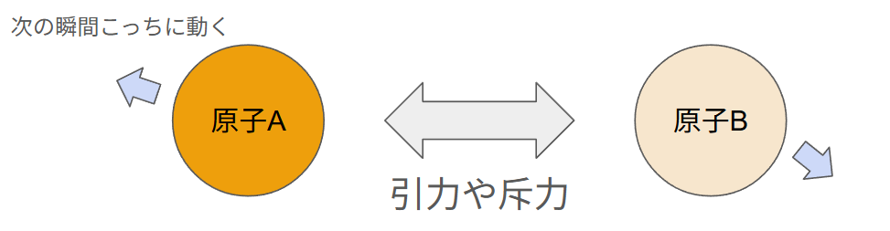 このような力や速度の計算(運動方程式)を全原子について計算して、ちょっとずつ動画のコマ送りみたいにシミュレーション内時間が進んでいきます。最終的にコマ送りをつなぎ合わせて動画になり、それを解析することで物質の様々な性質を知ることができます。