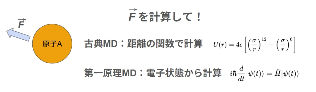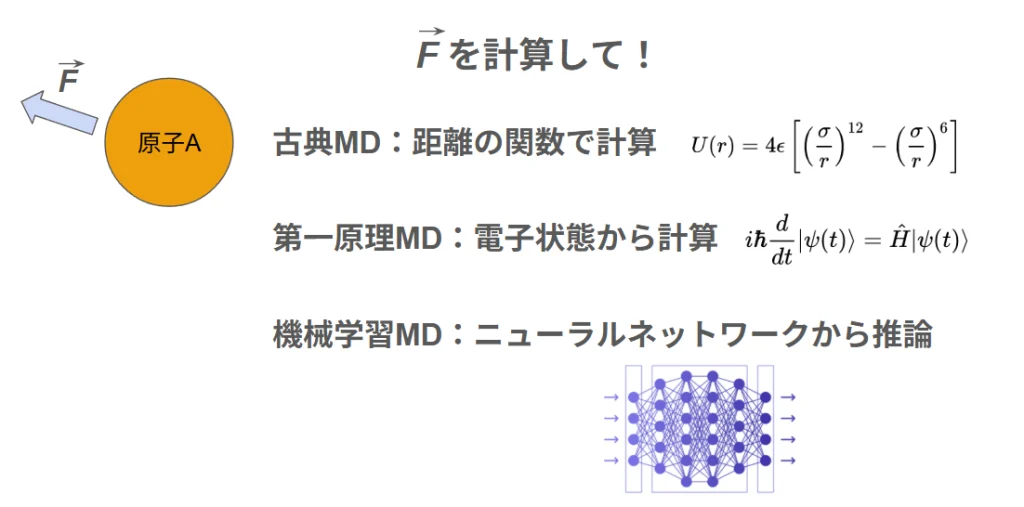 古典MD、第一原理MD、機械学習MDの3つの違いを大雑把に解説しました。違いは原子間に働く力の計算方法です。